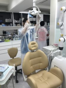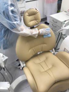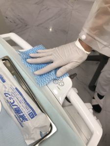 ドアノブ・ライト・診療台・器具置き場・スピットンを隅々まで拭きます。