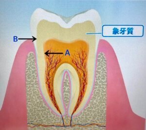 そうすると、Bのパイプの出口が露出するので、歯ブラシを当てた時や、冷たいものを食べた時に刺激が神経に伝わり、キーン⚡️という痛みが出てしまうのです😥