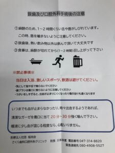 ・抜歯当日は激しい運動・飲酒・長い時間の入浴は控えるようにして下さい。←当日は血を止める事が重要なので、再度出血し、腫れや痛みが強くなる場合があります。