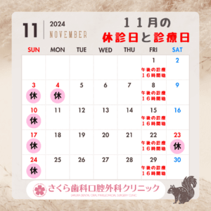 ※11月4日(月),11月23日(土)は、祝日のため、休診となります。